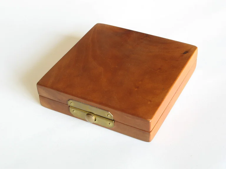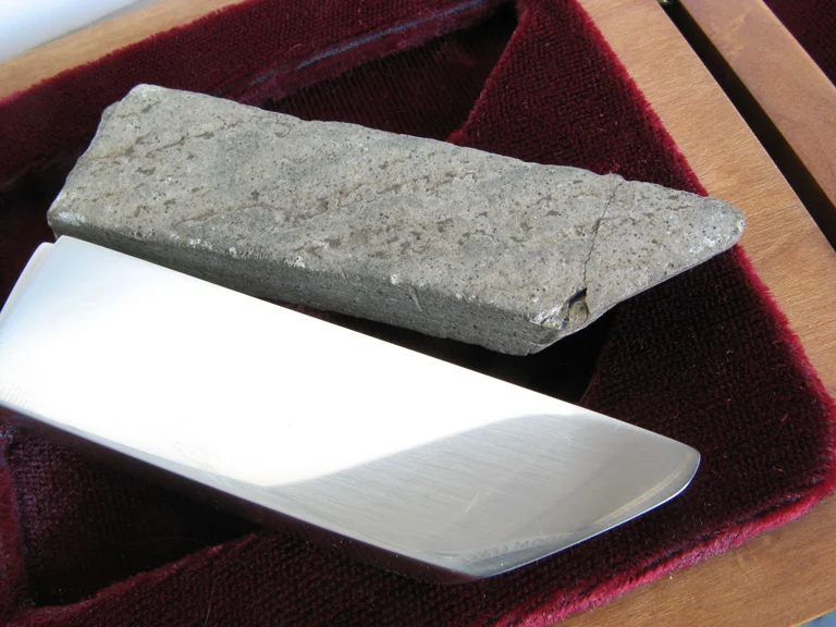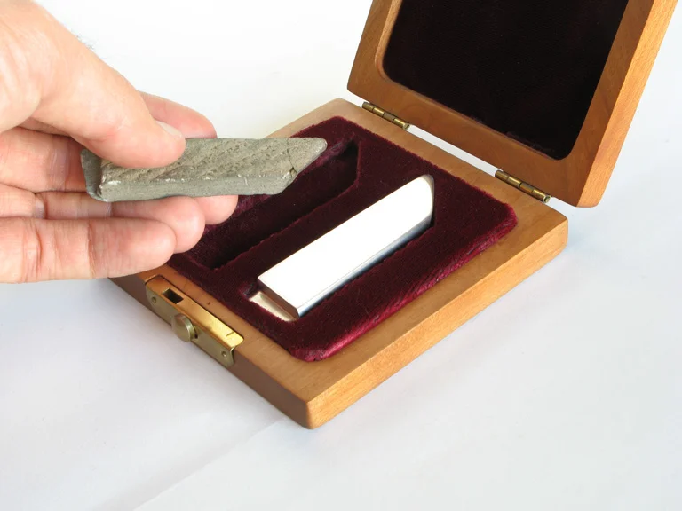 An unmodified stone with natural angles, edges and leverage is stored in a wooden box. The stone’s shape is carefully copied into stainless steel. Either or both tools can be removed from the wooden box for use.