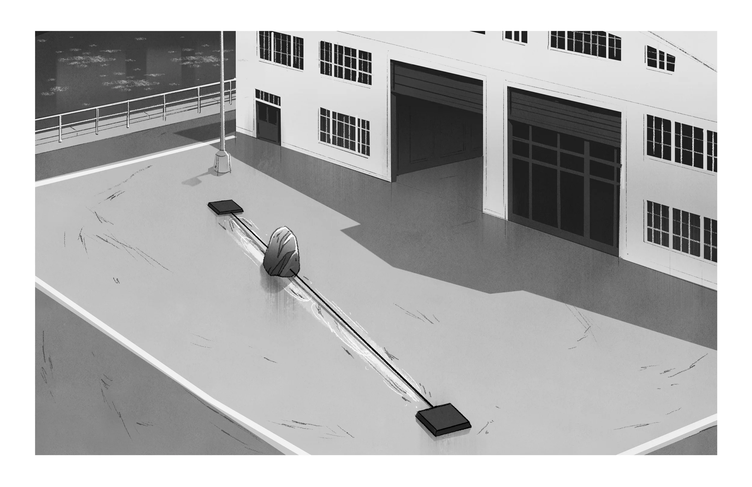 A locally procured boulder is placed in the installation space and has discrete metal anchors placed into it. Ropes, attached to custom winches, are connected to the anchors. The winches move the boulder very slowly through the space. The boulder moves at about 3-4 inches per minute with the sound of the boulder scraping against the floor being prominent (there is a strong sound component to this piece). Over the weeks that the piece runs, sand and pebbles are produced by the erosion of the boulder against the floor, along with a track from the boulder's motions.